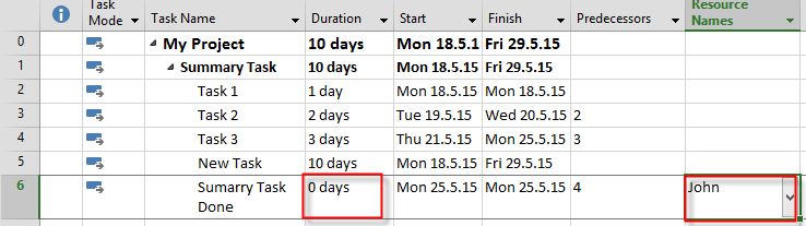 Now suppose that John is Project Manager, and by default, he is responsible for whole Project. What will you get if you assign him to Summary Task, like that?:![]()