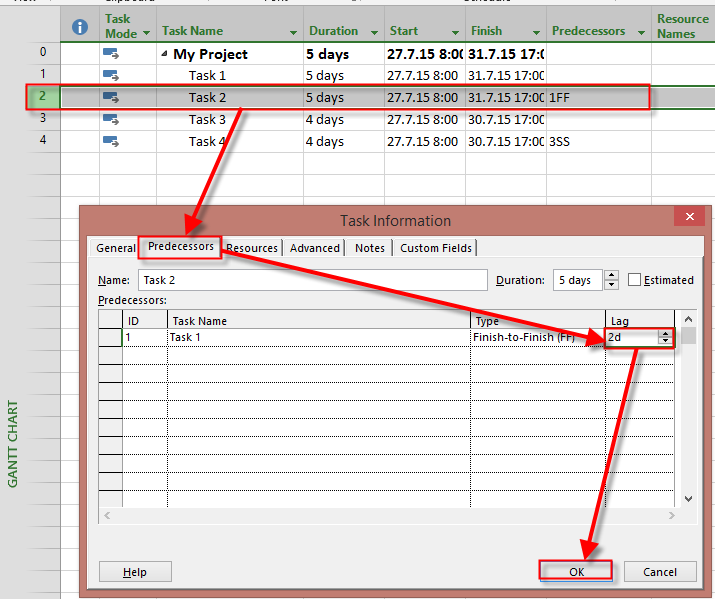 As you can see Task 1 and Task 2 have Finish To Finish relationship, and Task 3 and Task 4 have Start To Start Dependencies. Now, suppose that Task 2, and Task 4 have 2 days Lag: