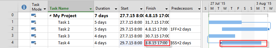 As you can see Task 2 will have Finish date 4.8.2105, and will start two days later, so it’s Start date is postponed!