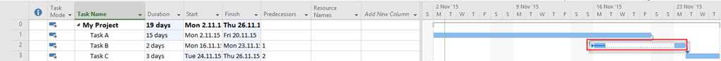 As you can see, Finish date of the Project is moved to Thursday 26.11.2015. BUT! 50% of previous finished Task 2 is not moved. And that make sense, because MS PROJECT is not supposed to move finished Tasks, or piece od partially Finished Tasks anywhere! If something is done, it is done! No matter of other Tasks! And as you can see the remaining part of Task B is rescheduled to the first working day after Task A is supposed to be finished. For example, if Task A has 12 days duration, the remaining part of Task B will start at Wednesday, 18.11.2015.