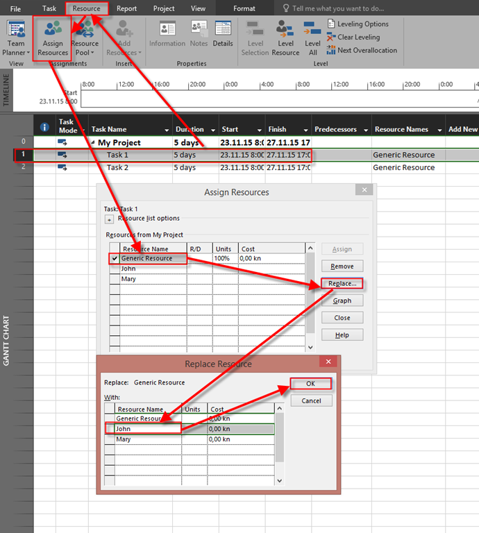 OK! Lets get back to our Project with Two Tasks. Now we are going to replace Generic Resource with John in Task 1, and with Mary in Task 2: