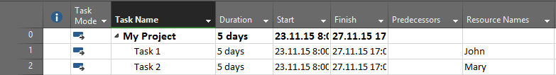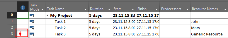As you can see, Generic Resource is NOT over allocated. Yes, you know that Generic Resource is Mary + John, and they are suppose to work from 23.11.2015 till 27.11.2015 on Task 1 and Task 2 respectively, but still Generic Resource in not over allocated because MS PROJECT does not know that Generic Resources is John + Mary.