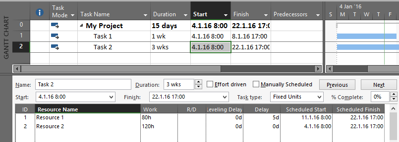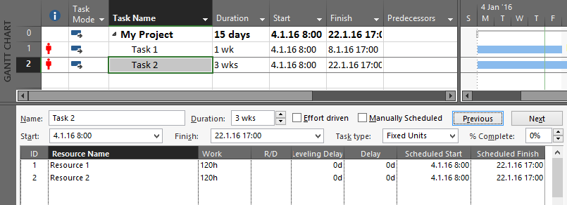 - If you extend duration of Task 1, or you add another Task in the same period when Task 2 should be done, Resource 1 will become over allocated, again. For example I will extend Task 1 from 1 to 2 weeks, and I will get: