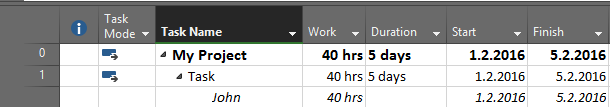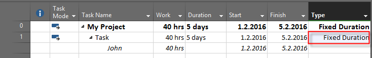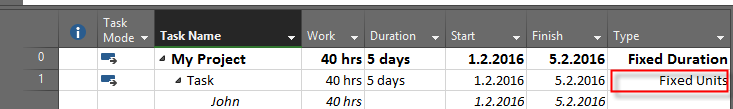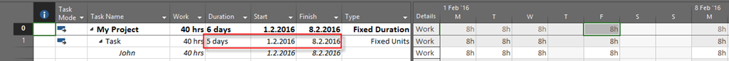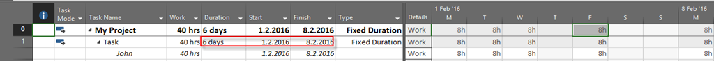 So, with Fixed Units, End date will be Monday, 8.02.2016, and Work will remain 40 hours. The same thing will happens if you use Fixe Work Task Type, so I’m not going to show you that. If you do not believe me, try it ![]()