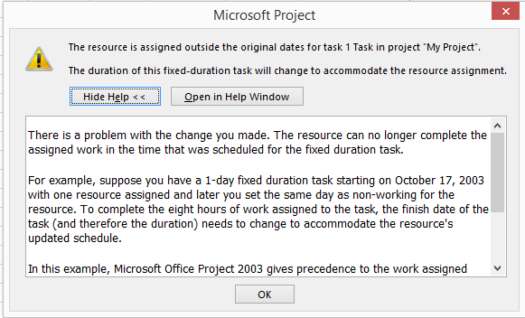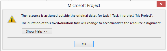 So, what it this post all about? About warning! As you can see with Fixed Duration, and Fixed work Task Type, there is no warning that Duration will change. If Task Type is Fixed Duration then, and only then, you will get warning that Duration is going to change.