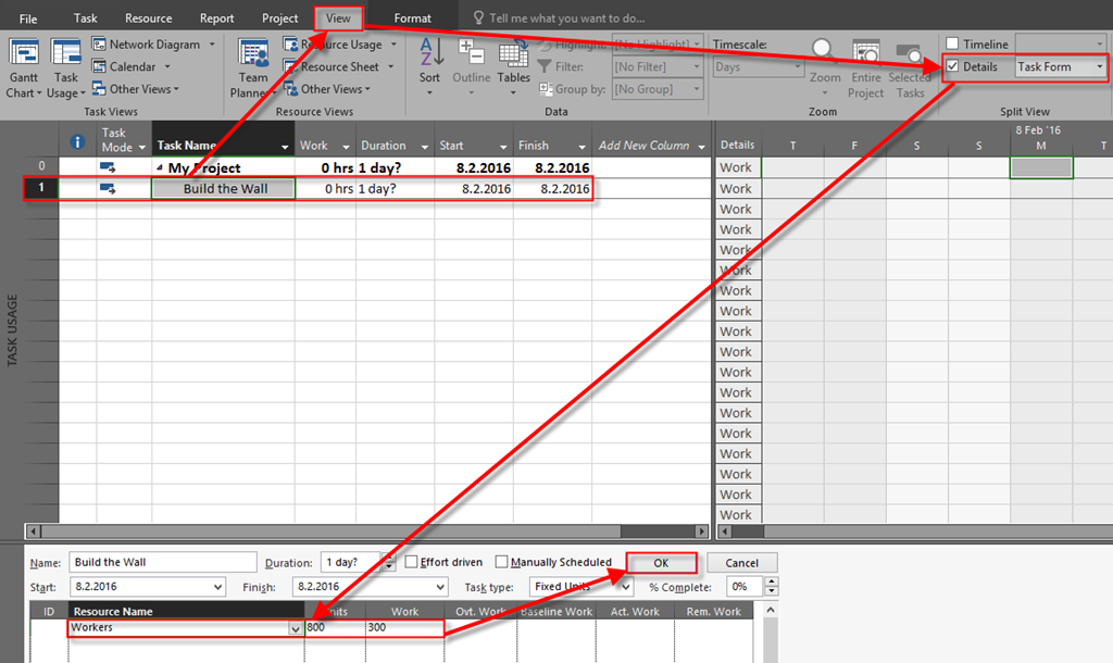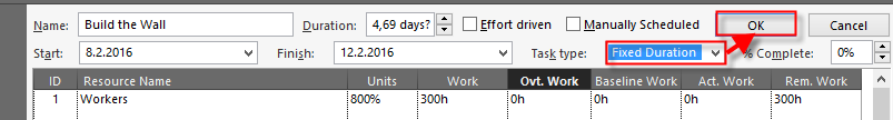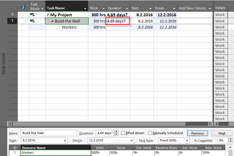 Duration of this Task should be calculated by MS PROJECT using workers. SO I will assign Workers to the Task, and I will put 800% for Units, and 300 hours to get Duration: