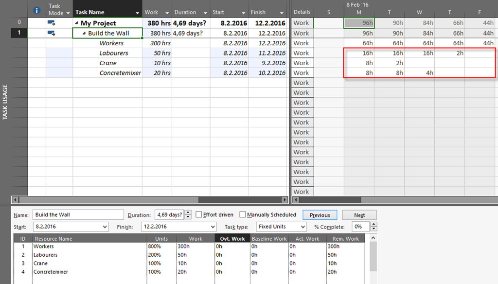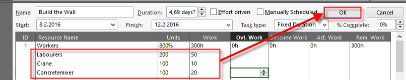 As you can see, I didn’t get what I wanted. Laborers will work only fist four days, Crane only first two days, and Concrete mixer only first three days. What Can I do? Well, before assign those resources I will switch Task to the Fixed duration mode: