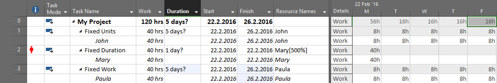 Fixed Units Task Type, and Fixed Work Task Type has Duration 5 days, because Duration = 40 / 100% (8 hours per day) = 5 days. But, Fixed Duration remains 1 day, because it is Fixed, and Mary should work 40 hours in one day which is impossible. So, when you have Fixed Duration Task Type DO NOT put hours in Task, but in Resource assignment. Why? Because when you have Fixed Duration, you should tell MS PROJECT how many hours in that duration should each Resource work, and in a Task put Duration instead of work. Then MS PROJECT knows Duration for that Task you want. It doesn’t make a sense to have Fixed Duration Task Type, and do not put that Duration in Task, does it?