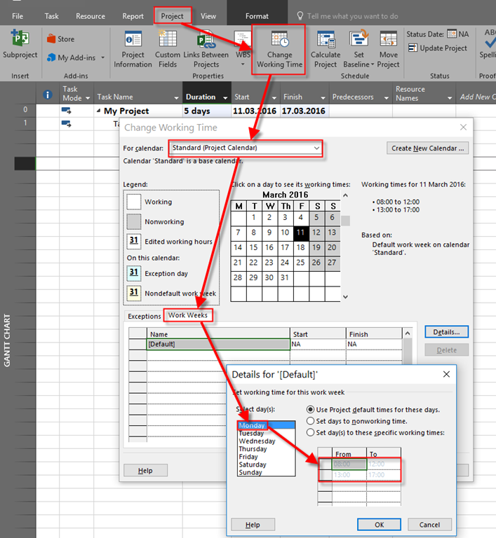 As you can see Task will start at Friday 11.03.2016, and since duration is 5 days it will end at Thursday 17.03.2016, because Standard Calendar is used, and weekend is non working time. You can see that here: