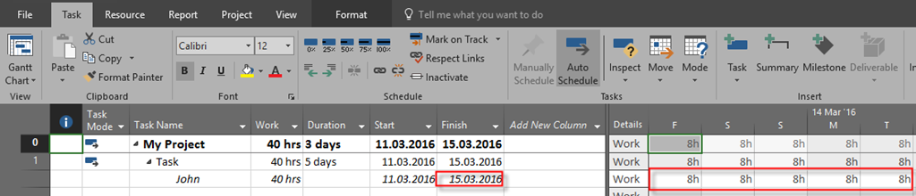 as you can see Finish date is now Tuesday, 15.03.2016, and John will work during the weekend.