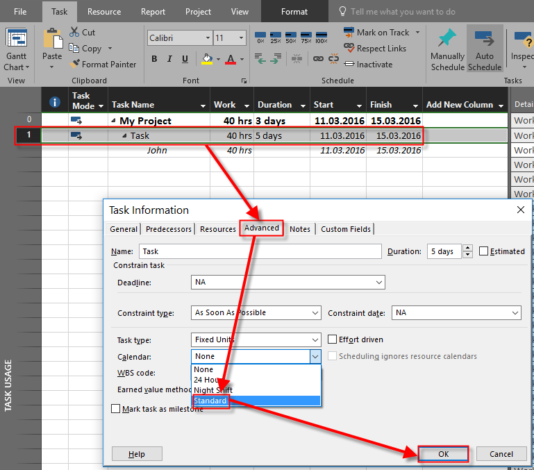 If in the example you just presented you change a task default calendar’s option None to Standard (Task Information>Advanced<Calendar), the resource John will no longer be scheduled to work on the weekend days 12/03/16 and 13/03/16, and the task will be scheduled as if no exception in John’s calendar for these 2 days making them working for John was made at all, and the task will be finished on 17/03/16 instead 15/03/16.