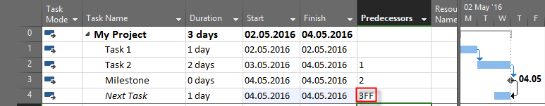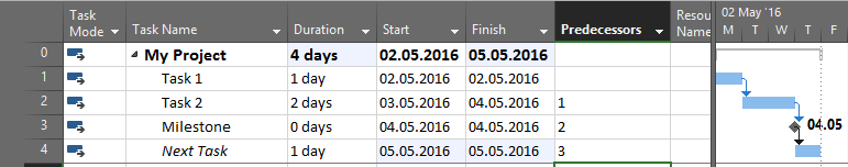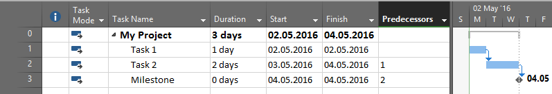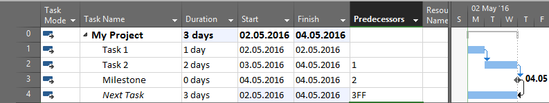 Now, you can see that Next Task will start earlier, at 02.05.2016, and that is exactly what I told to MS PROJECT: “Next Task should have 3 days duration, and it should be finished at the same time as Milestone, which is 04.05.2016”, and MS PROJECT has calculated Start date = Finish date – 3 days = 02.05.2016