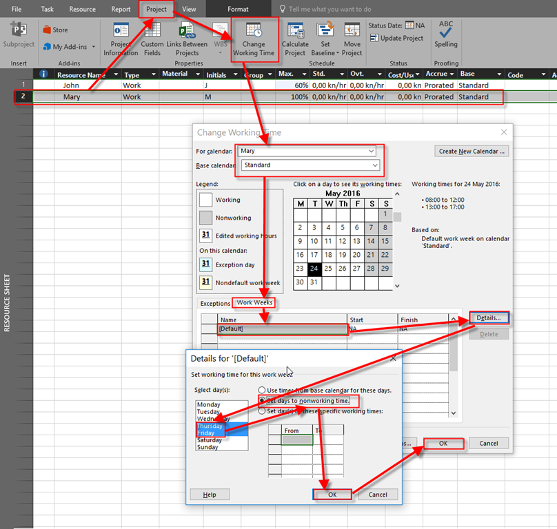 Mary, on the other hand will work 100% per day (e.g. 8 hours per day), but she will not work at Thursdays and Fridays, so to finish Task 2, which is 5 days long, she has to work 40 hours (Work = Duration * Units, e.g. Work = 5 days (8 hours per day) * 100% Units = 5*8* 100% = 40 hours!). She will work 5 days and 8 hours per day on her working days, and that means that she has to work From Monday to Wednesday (3 working days) and then Monday and Tuesday next week, to accomplish her Task.