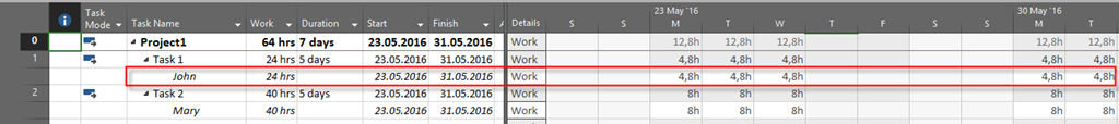 You can see that John and Mary will work same Days (From Monday to Wednesday, and then Monday and Tuesday next week) but since John is only 60% allocated to this Task, he will work 4,8 hours per day which is 24 hours in Total.