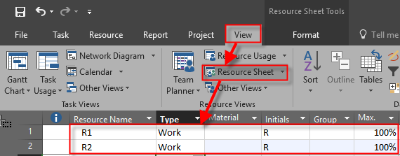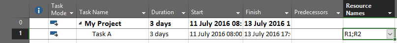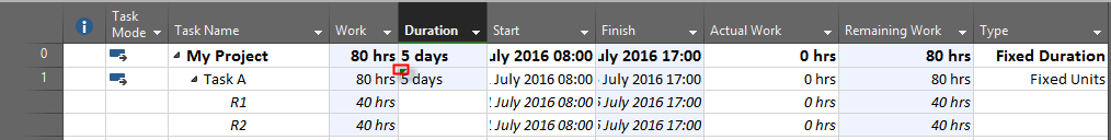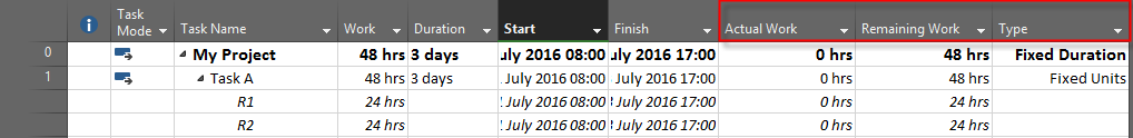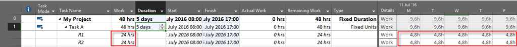 Task A = 3d with Resources R1 and R2 assigned at 100% each. Work is 48h . R1 work = 24h, R2 work = 24h