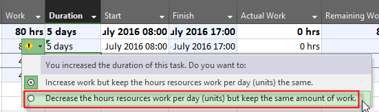 If I change Duration on that Task Type, I will not have to choose anything to get the same result, because by default, Fixed work means that if I change Duration, work will remain the same (e.g. 24 hours per Resource), and it will be spread among 5 days (e.g. each Resource will have to work less per day on that Task).