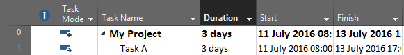 First I am going to create brand new Project with one Task with 3 days Duration: