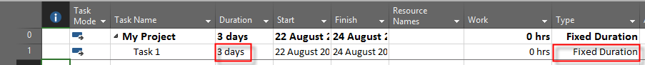 As you can see task is Fixed work type, and I put 3 days in the Duration.