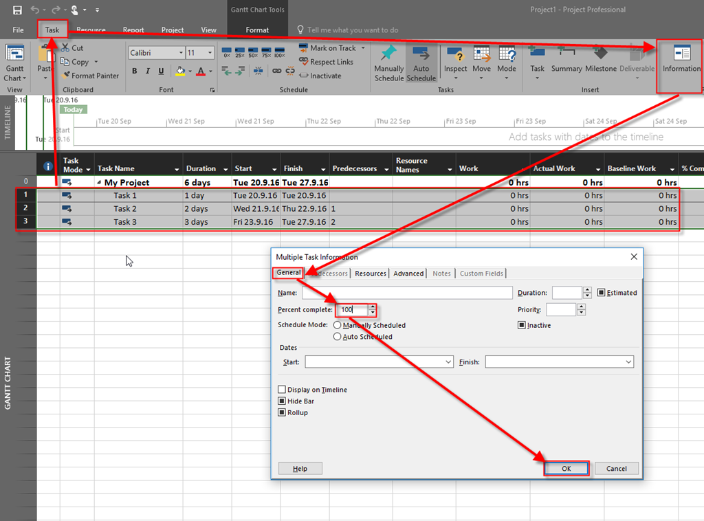 This is a basic thing in any version of MS PROJECT. I will show you a simple example an I will explain why this is not a bug at all. I’ll use MS PROJECT 2016!