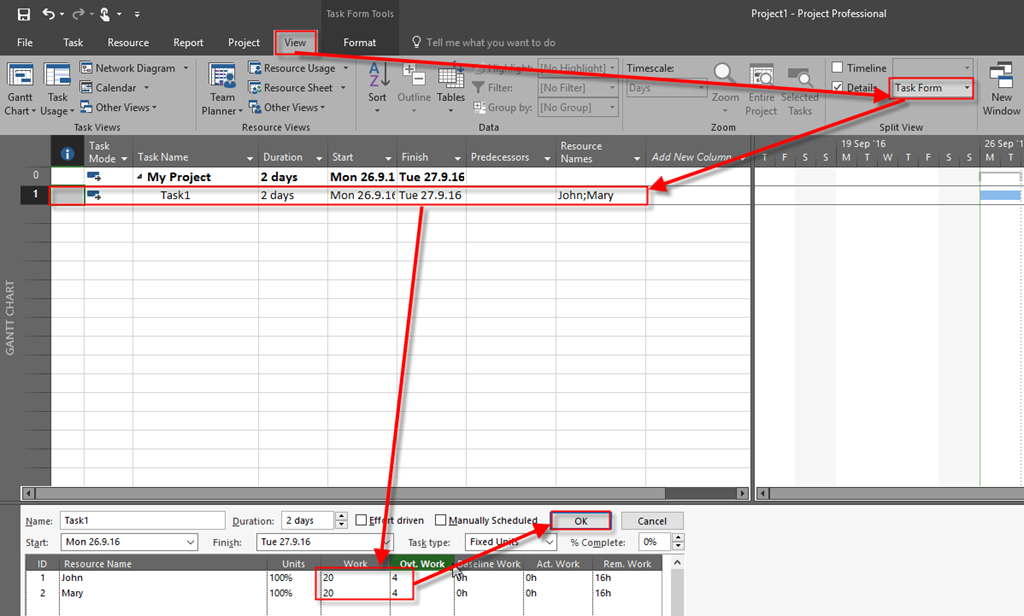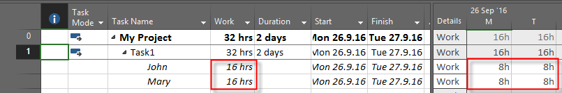 I want to put different overtime Work for a Task and Resources. Let’s say that I have Task1, and John an Mary are assigned to it. Task has 2 days Duration, which means that John and Mary will work 16 hours (8 hours each day). but I want John to work 12 hours first day (8 hours Regular work, and 4 hours overtime work) at FIRST DAY, and Mary has to work the same way on the Second day. How to accomplish that?”