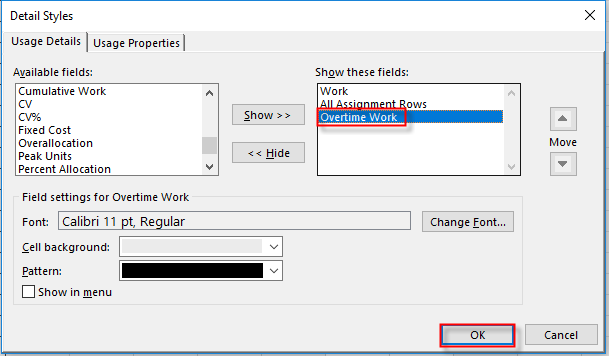 As you know, John is supposed to work 12 hours on Monday (8 hours Regular work, and 4 hours Overtime work), and Mary has to work the same way on Tuesday. what I have to do I to assign John 12 hours in Work field, and 4 hours in Overtime work field on Monday, and the same for Mary but at Tuesday. firs I am going to show Overtime work field on the right side of Task Usage view: