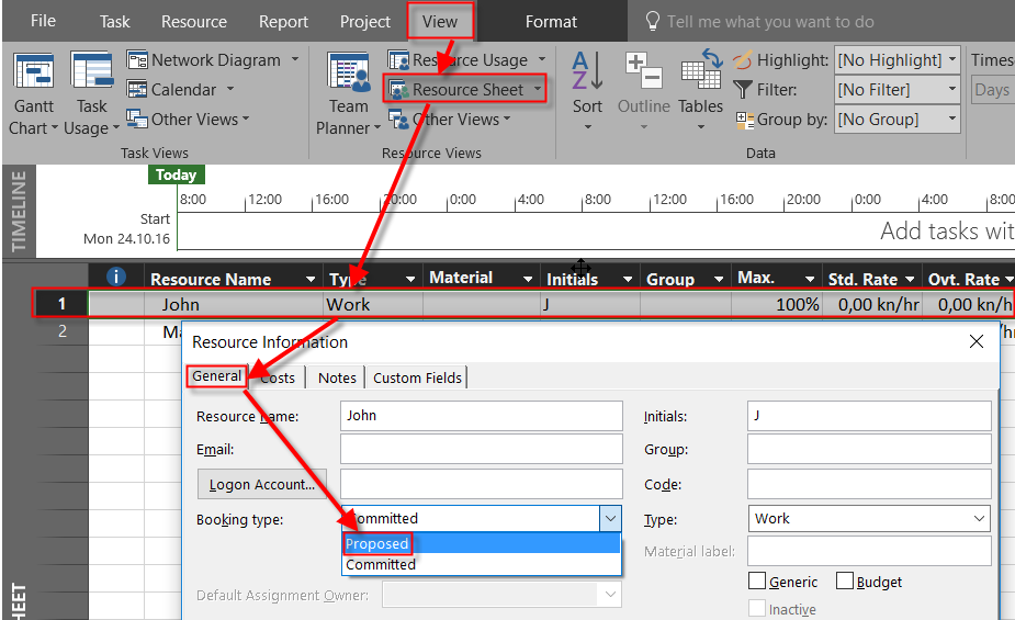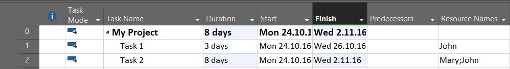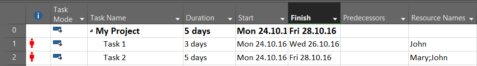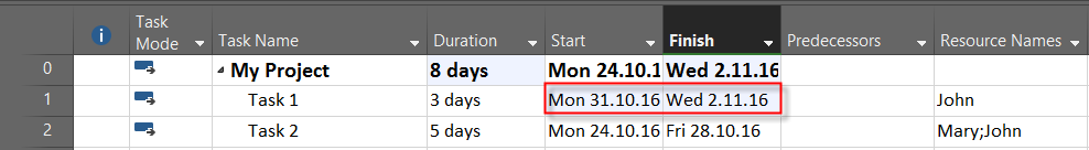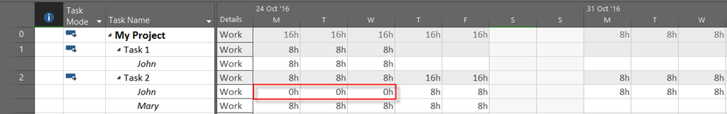 As you can see, Task 1, is moved to Start at Monday, 31.10.2016, because at that time John is available to work without any over allocation.