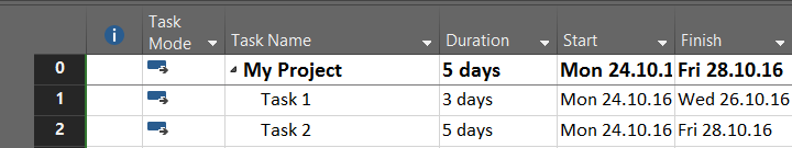 Now Task 1 is not moved to start at Monday, 31.10.2016, but it has longer duration instead. To explain that, I will show you Task Usage View, after this leveling: