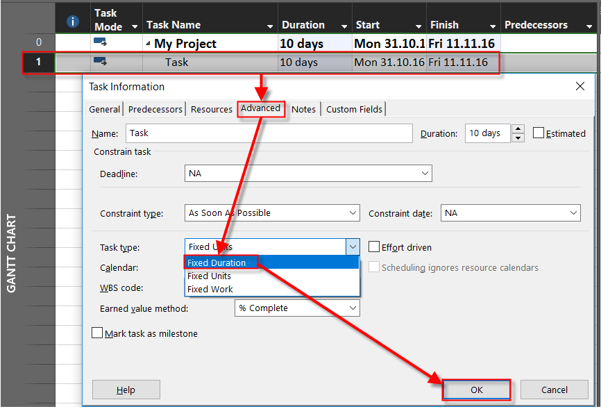 first I will create new Project with one single Task, duration = 10 days. As you can see from the question, this Task should last 10 days (2 weeks), so I have to make it Fixed Duration: