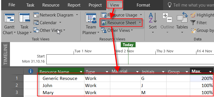 I will create three Resources: Generic Resource, John, and Mary. Notice that Generic Resource will have 200% Max Units (just for example):