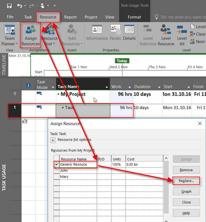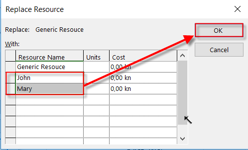 As you can see, because I have two resources now, MS PROJECT calculates 48 hours for John (as a replacement for Generic Resource), and 40 hours for Mary (as a new added resource).