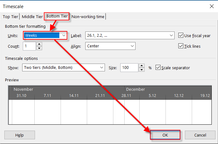 I will adjust Timescale to weeks, so I can see work per week in the right part of the screen: