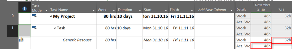 “Hi Nenad and thank you very much for your blog. I have a question for you. Suppose you have a 10d task with a generic resource assigned to it ( total work 80h ). After 5 days you have to track the progress and enter these actuals: work done 48h, remaining again 48h and 2 resources to use in the second week.