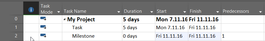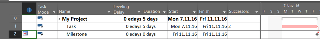 First I will create brand new Project with one Task and one Milestone, and I will make this milestone as Successor of the Task: