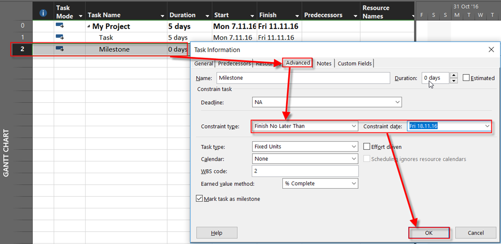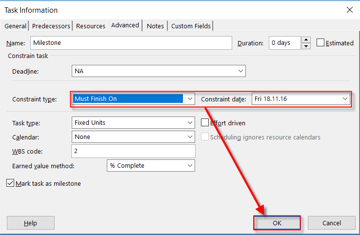 Now, I will put the constraint “Finish no later than” for this Milestone, and the date will be 18.11.2016: