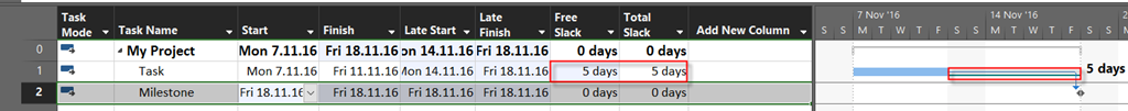 Now, Milestone has fixed date for finish, and it is 18.11.2016, and it should be not finished earlier, so Task has Slack (float) 5 days, e.g it can last 5 days longer!