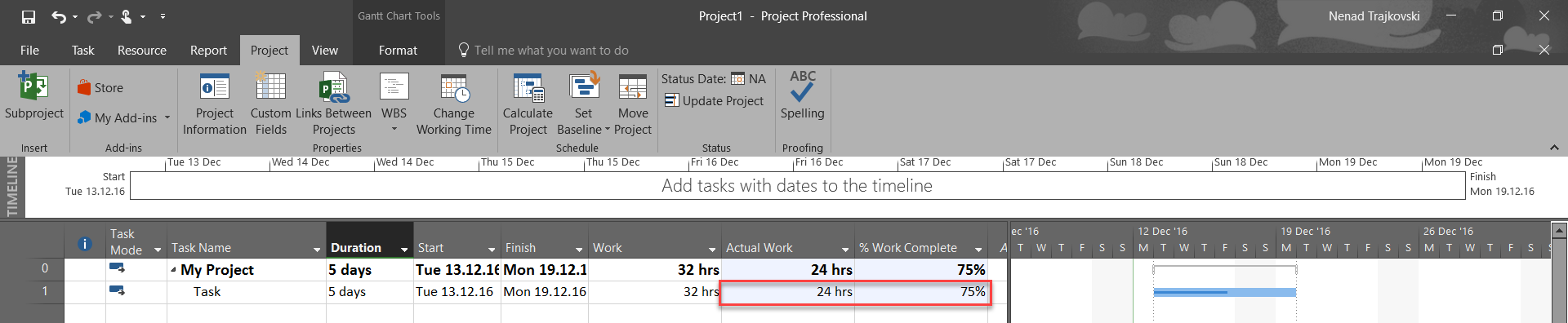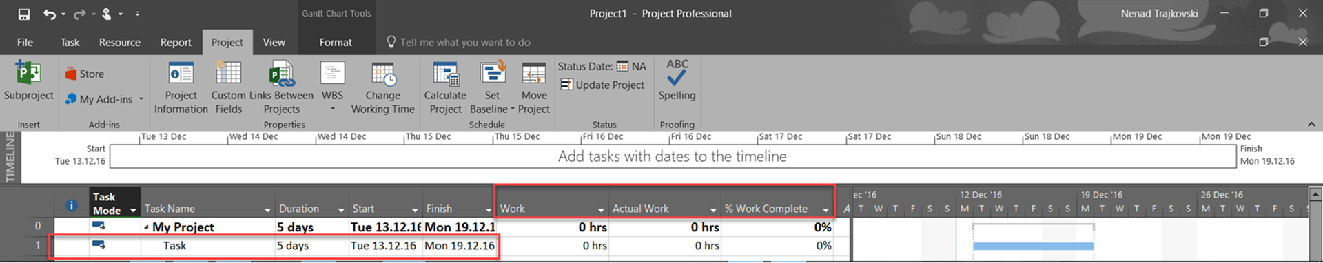 I wrote several Posts about % Work completed field, and how does it change when assigned Resources to the Task. As you know, Work is 0 hours until you assign Resource to the Task. But, is it possible to have Work for the Task and % Work Completed without assigned Resources. The answer is YES, and II ‘ will show you how with MS PROJECT 2016!
