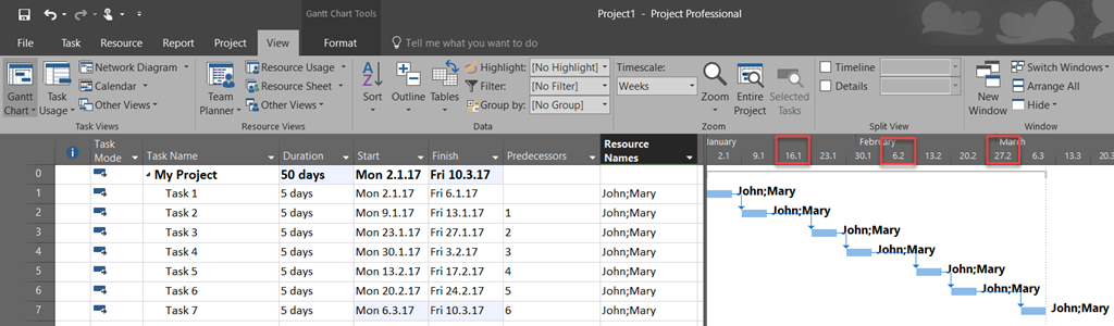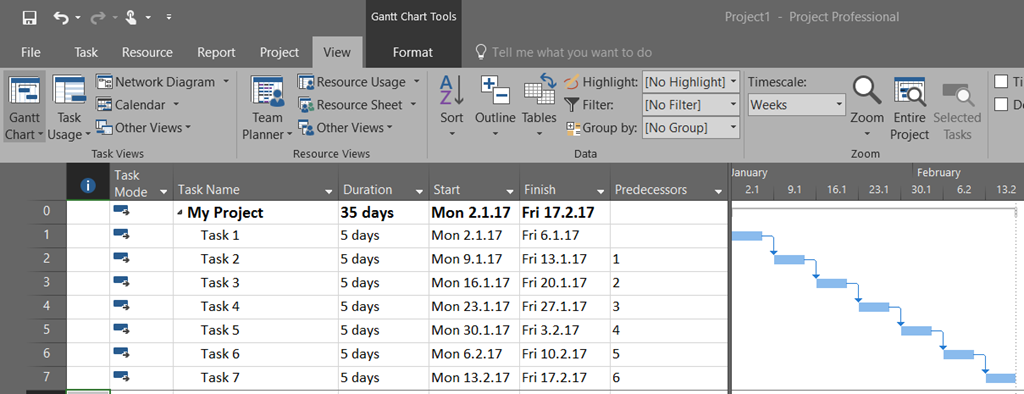 First I will create a simple Project with 7 Tasks, and each of them will have 5 days Duration: