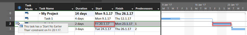 As you can see, Task 2 has a new Starting date, and constraint: “Start No Earlier Than”.