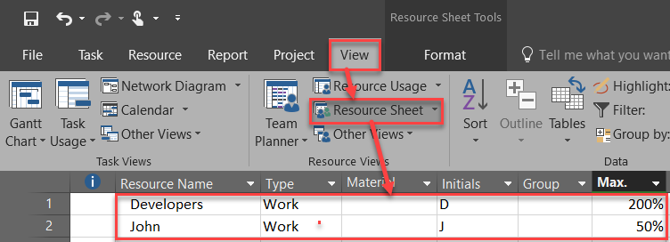 I will explain this with MS PROJECT 2016! First of all I will create wo Resources: Developers with Max. Units = 200%, and John with Max. Units = 50%.