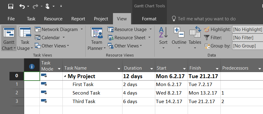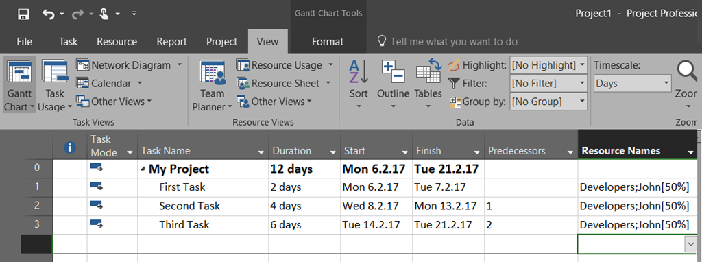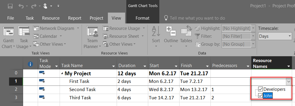 Finally I will assign Developers and John to all three Tasks, through Gantt Chart View: