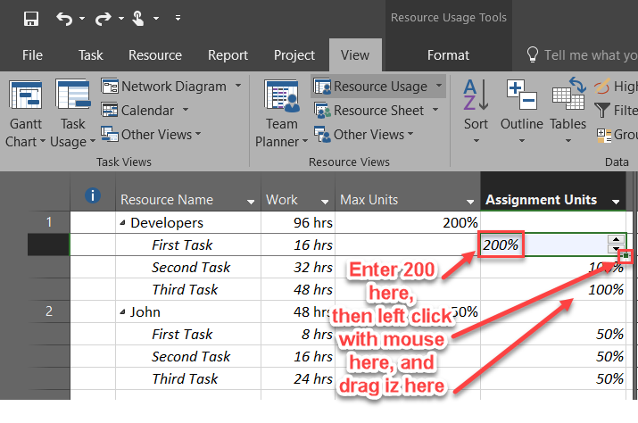 Now, how can you change Assignment Units for all Tasks. For example, you want to put 200% for all Tasks for Developers. Because this is not video, I will show you one way to do that: