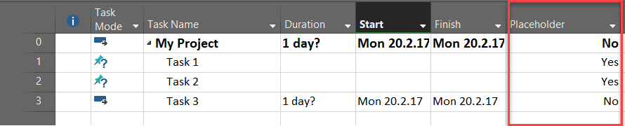 So, it is easy to understand how Placeholder is set. you may wonder when to use it? Suppose that you have a Project with, for example, 750 Tasks. Some of them are Auto scheduled, and have TBD in Start date field, or duration field, etc. Those are placeholders. And, by simple filtering Tasks where Placeholder = YES, you can find out which Tasks are not scheduled yet, and they are bottleneck for finishing your schedule.Very useful Field, from my point of View.