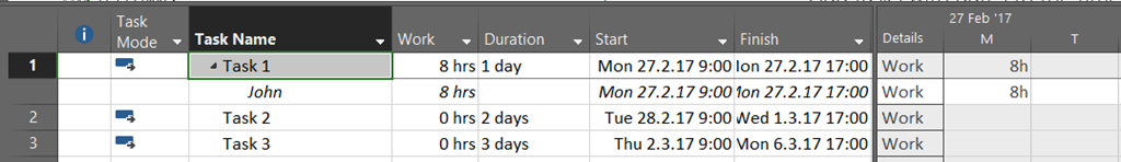 Suppose that I have John as Resource, and I assign him to Task 1. I will have (via Task Usage View):