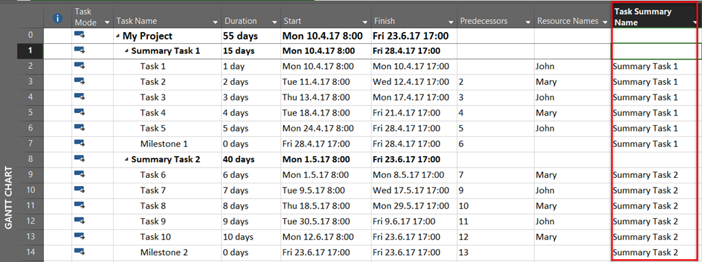 The Task summary name field will be especially useful if there are nested summary tasks, i.e. a summary task that has summary tasks(s) under it and more summary tasks under them.