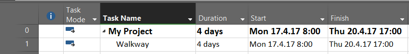 First I will create the Project with Task – Walkway, and with 4 Days Duration: