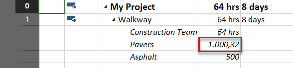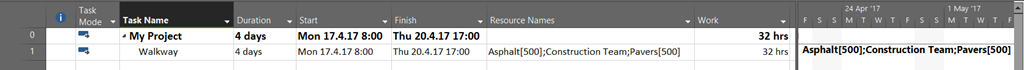 As you can see, Asphalt and Paver is unchanged (quantity remains 500). Why is that? It is because MS Project will treat Material Resources as they should be treated. When work in hours for Work resources is increased, it does not mean that more material is needed for the Task. For example, if you build a wall, and you need 1000 bricks for it, and 100 hours, if you find out that you need 30 more hours it does not automatically mean that since you need more time you need more material.