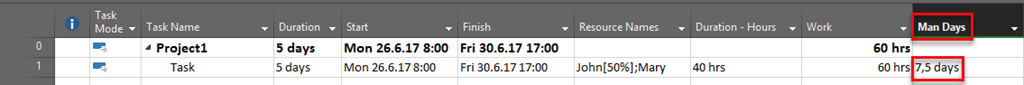 As you can see, in Man Days I’ve got 7,5 days (60 hours of total work / 8 hours per day shown in Hours per Day = 7,5 days).