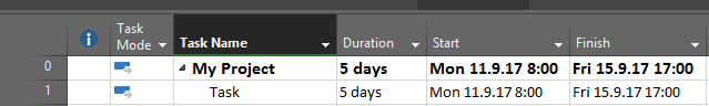 I will show you the solution using Microsoft Project 2016. first I’m going to create very simple Project, with one Task:
