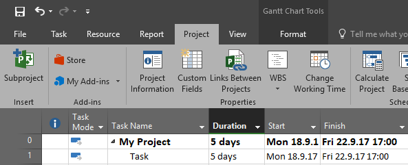 First let me show the “issue”. I will create brand new Project in MS PROJECT 2016:
