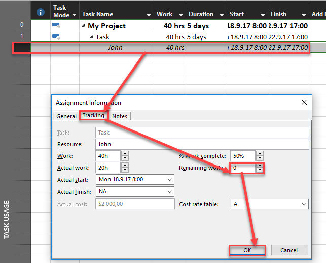 As you can see, since John had worked 20 hours, it had spent $2000. Of course he had spent 2,5 days at work at this Task, as well. So it is not reasonable to make this Task inactive. Inactive means – I do not need this Task, nor someone is going to work at it – ever. But, if someone had already spent some time on that particular Task, than you can’t consider it as not needed. But, on the other hand, let’s say that noone will work on that Task anymore, but 20 hours are already spent, and you want to finish id with no further work. In that case you can do this (I am going to use Task usage View):